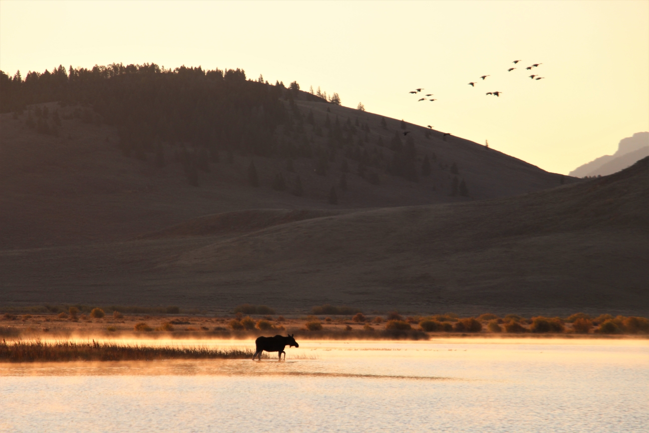 At Red Rock Lakes National Wildlife Refuge in Montana, a cow moose stands at the edge of Widgeon Pond at sunrise. Steam rises off the pond and geese fly overhead as early morning light bathes the landscape.