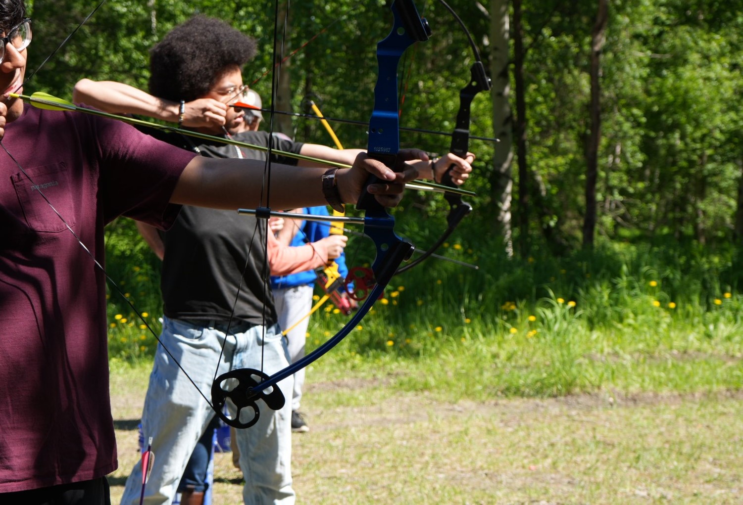 Kids with TRIO youth organization participate in NASP archery with USFWS instructors at a youth lake fishing/archery event near Anchorage, AK.