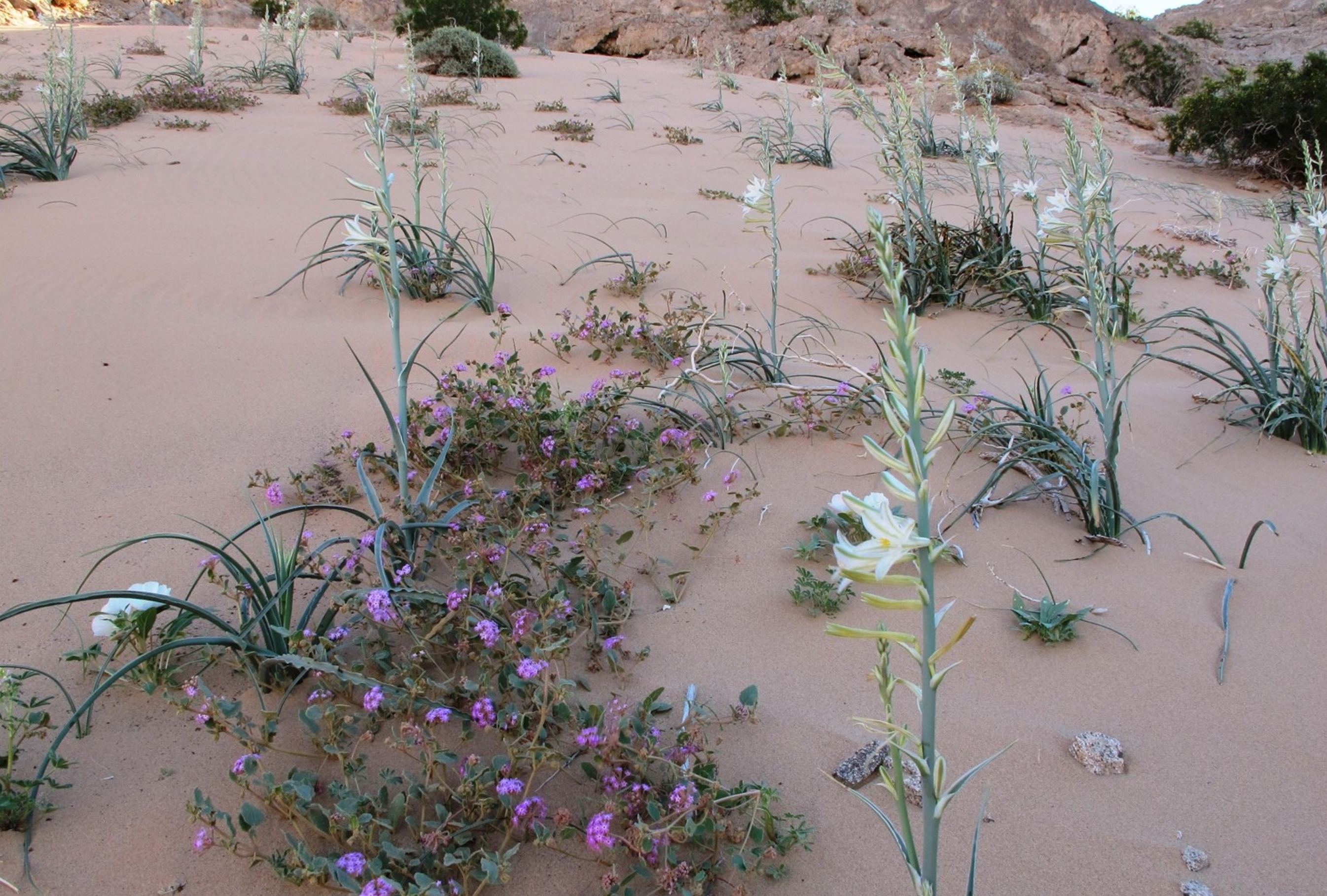 Native Ajo lilies and sand verbena on the Yuma Dunes.