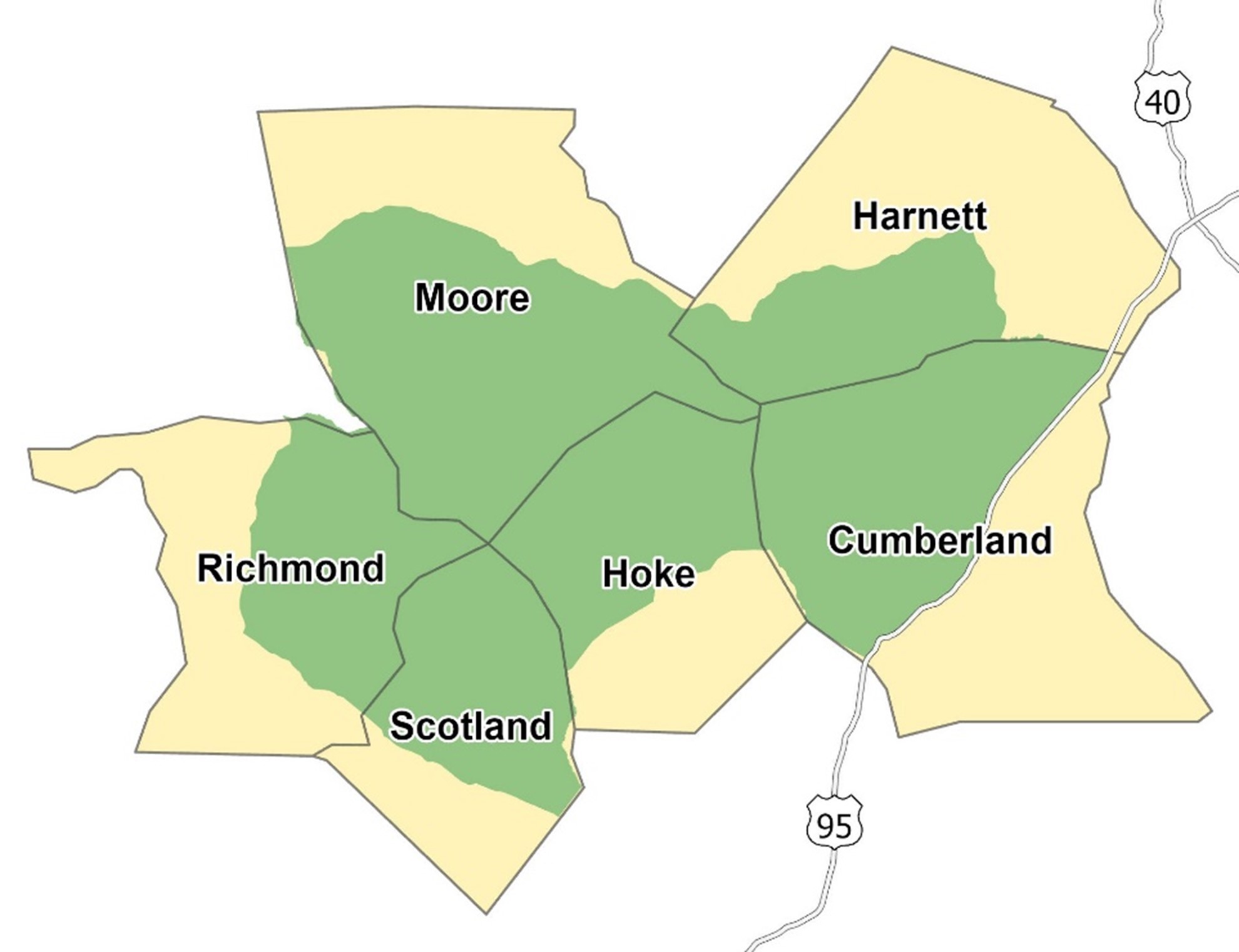 Boundaries of the North Carolina Sandhills red-cockaded woodpecker Safe Harbor program.