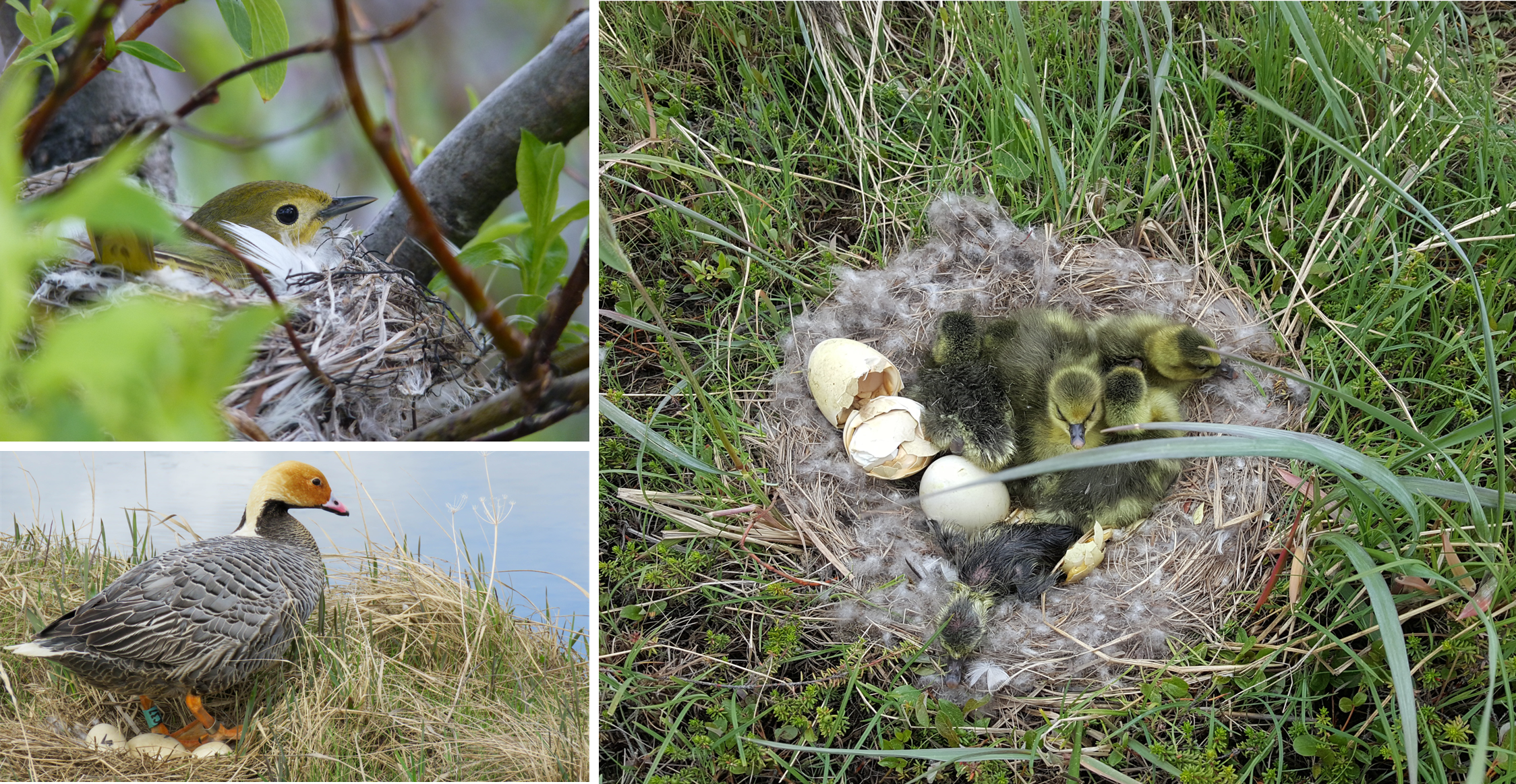 Clockwise from upper left: A yellow warbler nesting in a tree; ground nesting cackling geese; a female emperor goose on her nest.