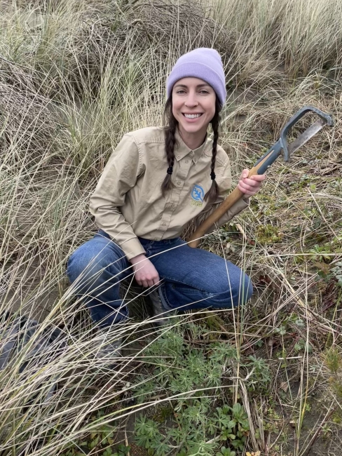 Student Conservation Association (SCA) Intern Nicole Matonak removing invasive plant species at the Lanphere Dunes