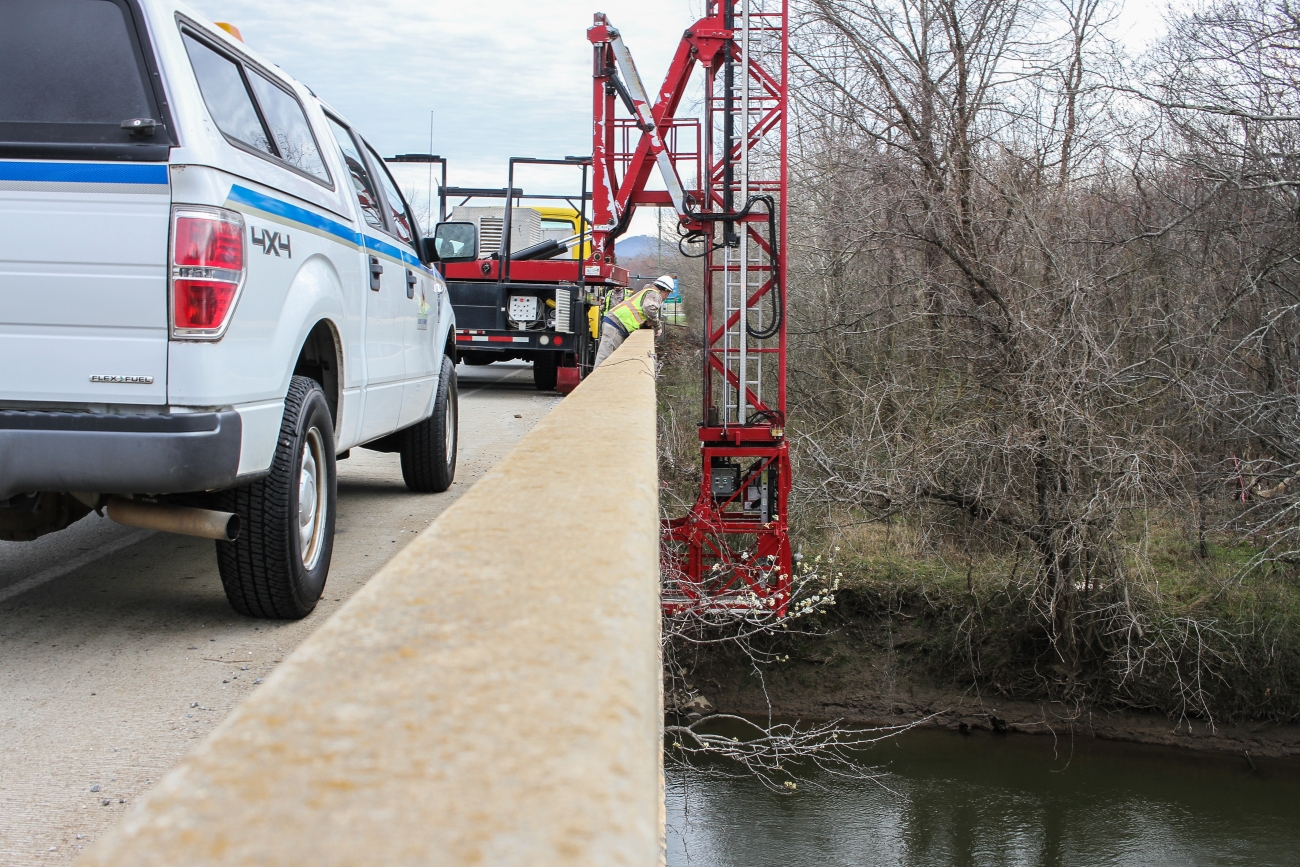A North Carolina Department of Transportation crew deploys a mobile catwalk to access the underside of a bridge across the French Broad River in order to install bat roosting structures.
