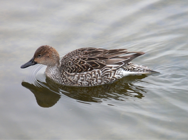 Female Northern Pintail. Slim and long-necked, the Northern Pintail has a distinctive silhouette. The male is easy to identify by his striking markings and long tail, but even the female can be recognized by her graceful, long-necked shape.