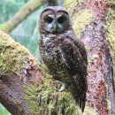 The northern spotted owl is one of three spotted owl subspecies native to Pacific Northwest old growth forests ranging from southern Canada to the Klamath region of northern California. The northern spotted owl is classified in the family Strigidae, genus Strix, and is a medium-sized dark brown owl with large dark eyes.