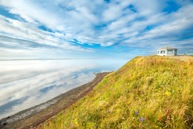 Observation gazebo at Grant Point looks over a calm Izembek Lagoon
