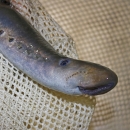 Service biologist Damon Goodman holds a Pacific lamprey at the Van Arsdale Fisheries Station in Potter Valley, California.“It was a really cool feeling seeing the first one pop out of the top (of the migration tube). There were high-fives all-around. We figured if they are using their suctorial disks to climb up, why couldn’t they climb up a tube,” he said. Credit: John Heil/USFWS