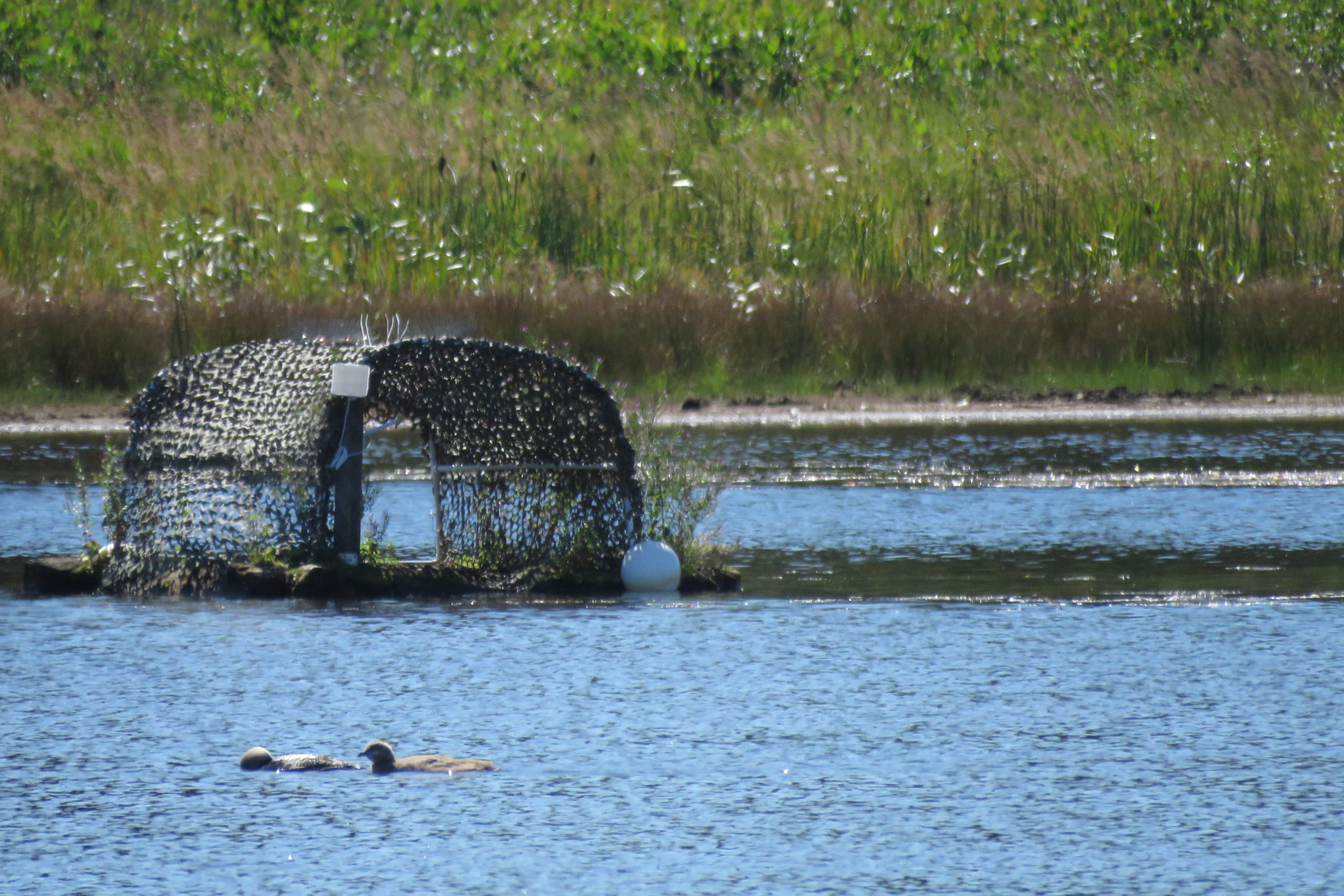 The Pacific loon chick (right) swims with one parent (left) on August 12, 2022. Eighteen days later, one parent and the loon chick leave Connors Lake.
