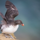 Parakeet auklet lands on St. Paul Island, largest of the Pribilof Islands, in Alaska Maritime National Wildlife Refuge.