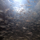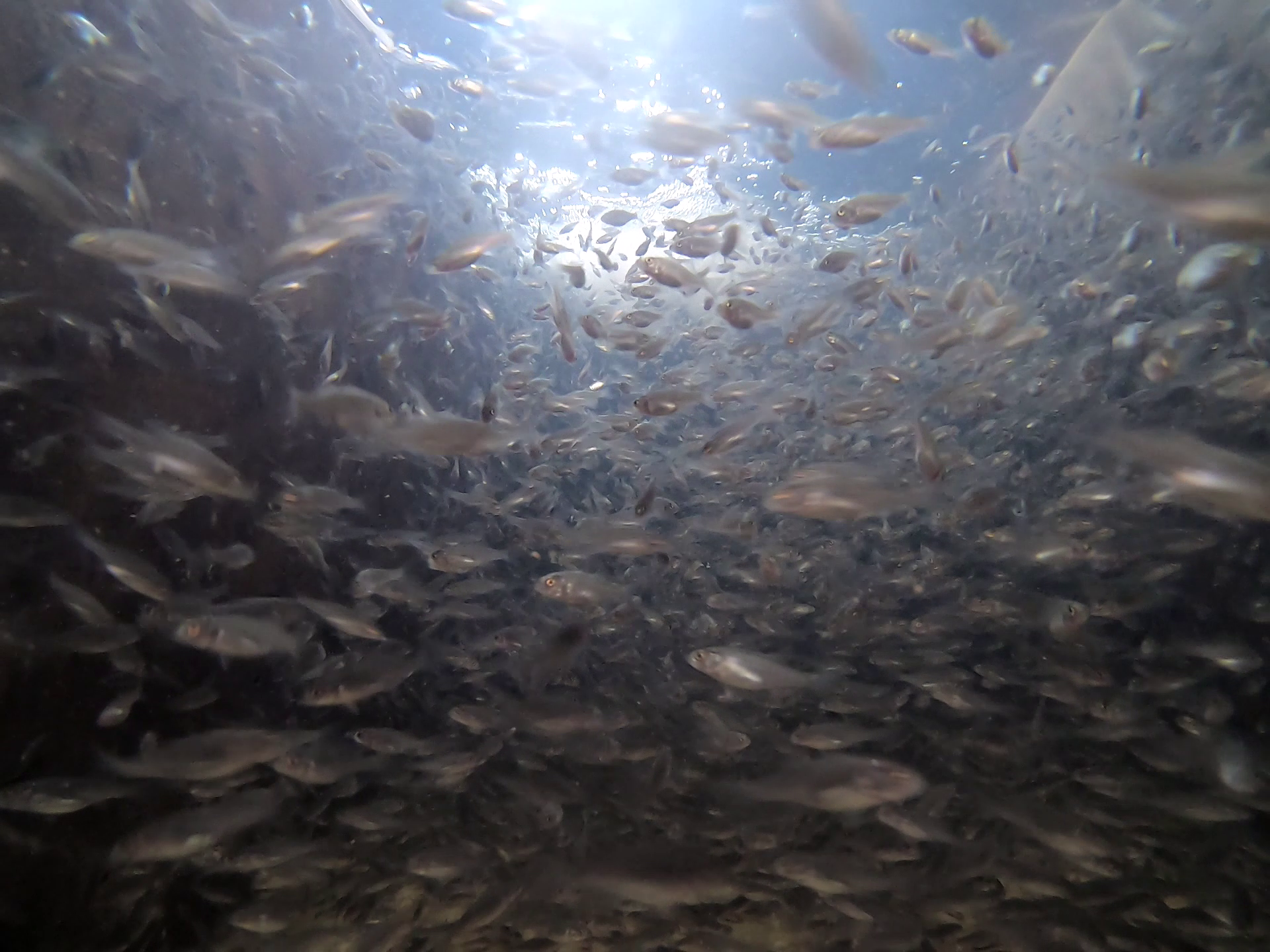 This underwater photo was taken of our young striped bass. They are harvested out of their pond about one month after being stocked as larval fish.