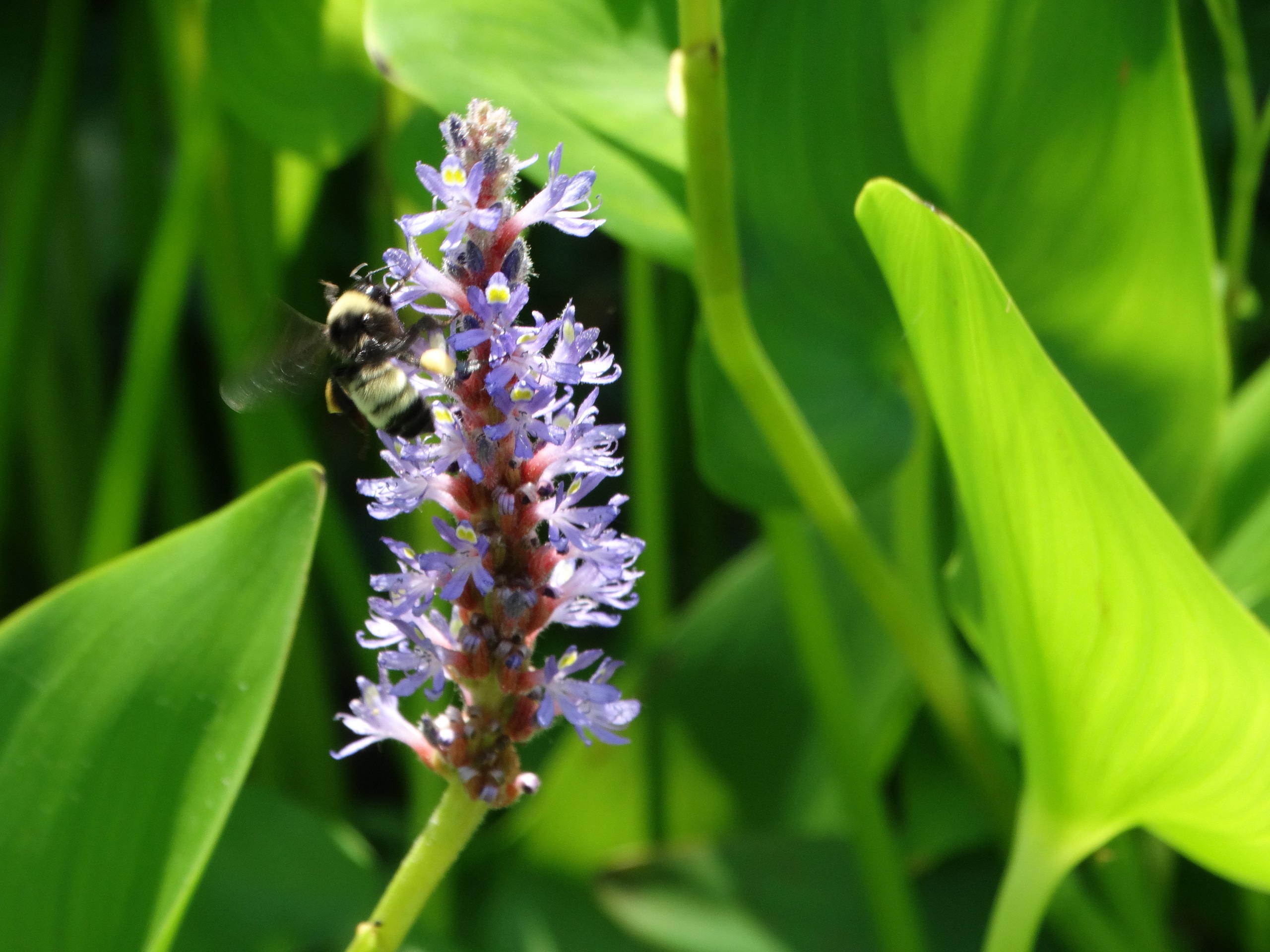 Purple stand of Pickerelweed flower with bee, surrounded by large bright green leaves