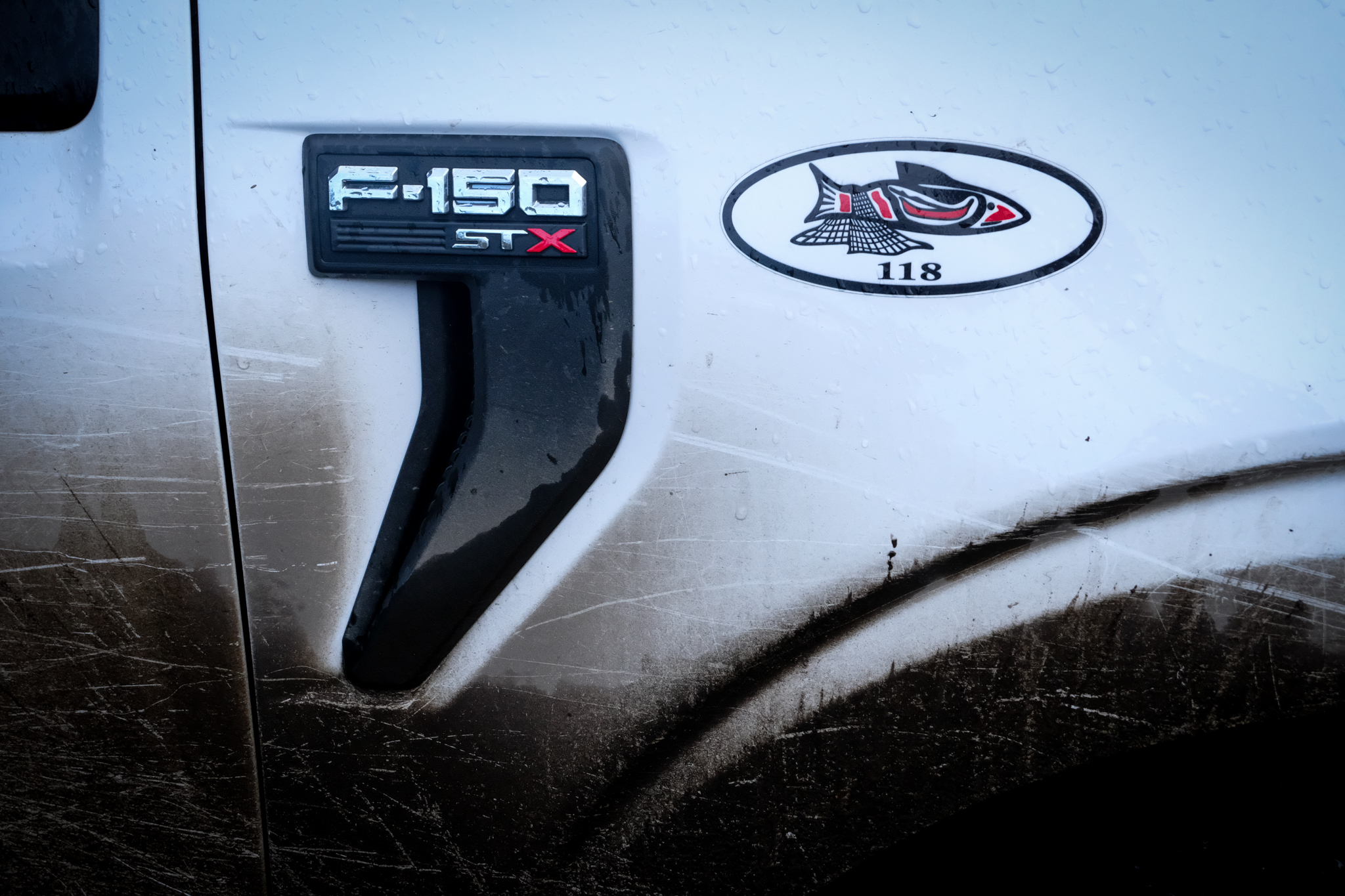 A Nisqually Indian Tribe sticker on a pickup truck at Kalama Creek.