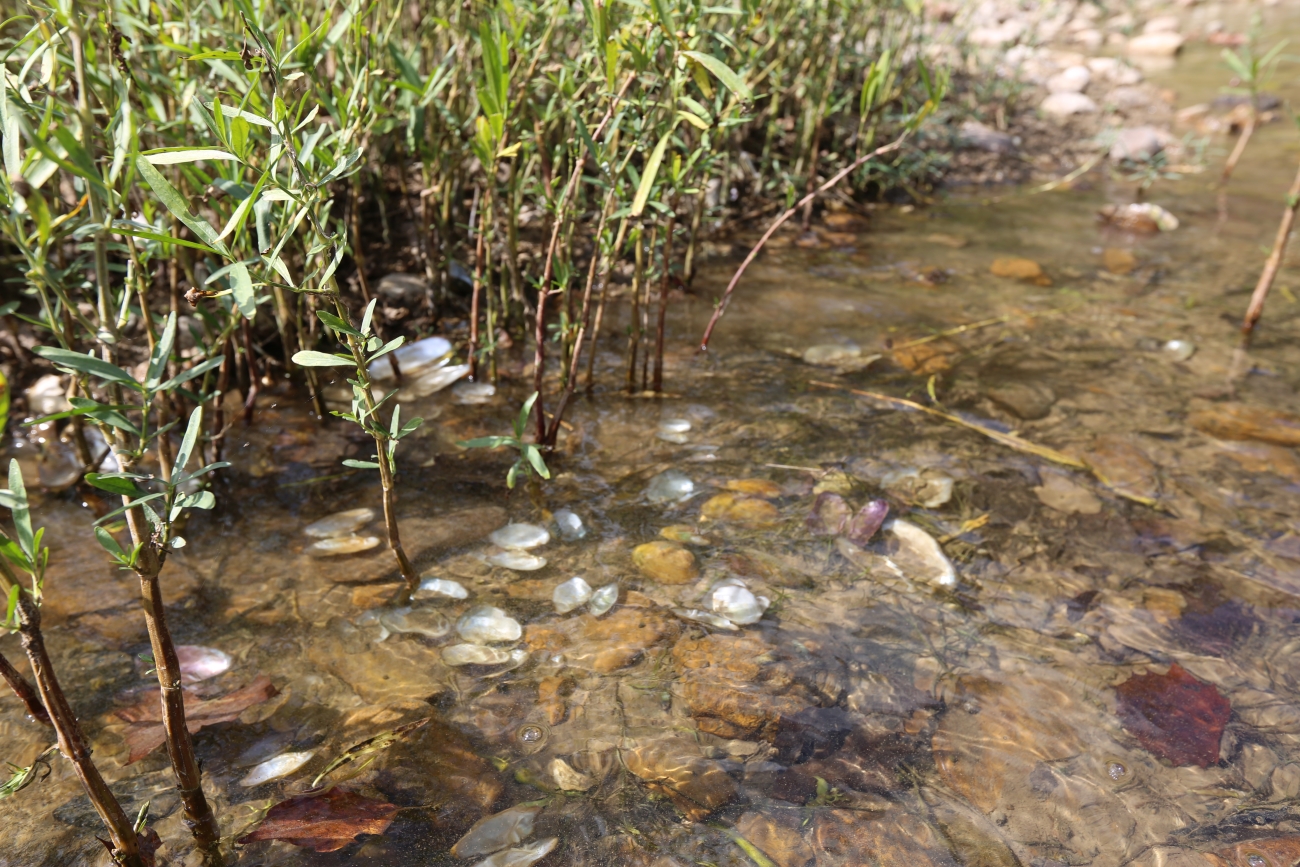 A variety of recently dead freshwater mussels are easily seen from the shores of Wallen Bend on the Clinch River.