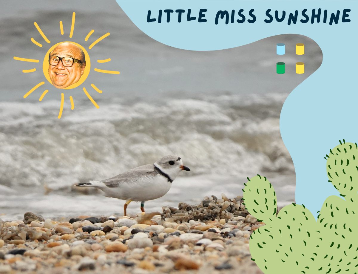 A banded piping plover facing right on a gravel and sand beach backed by a gentle oncoming wave. The graphic reads “Little Miss Sunshine” with a sun featuring Danny Devito's face in the upper left of the image and a stylized prickly pear cactus in the lower right. Four cylinders representing this bird’s band combination are in the upper left: light blue over dark green on the left and yellow over yellow on the right.
