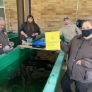 Quinault National Fish Hatchery crew, including Ed, Jane, and Joe Lemieux (Tribal TERO Employee) sampling juvenile salmon. This "fish per pound" sampling helps determine what food pellet size is appropriate for the fish as well as how much tank or pond space they need.