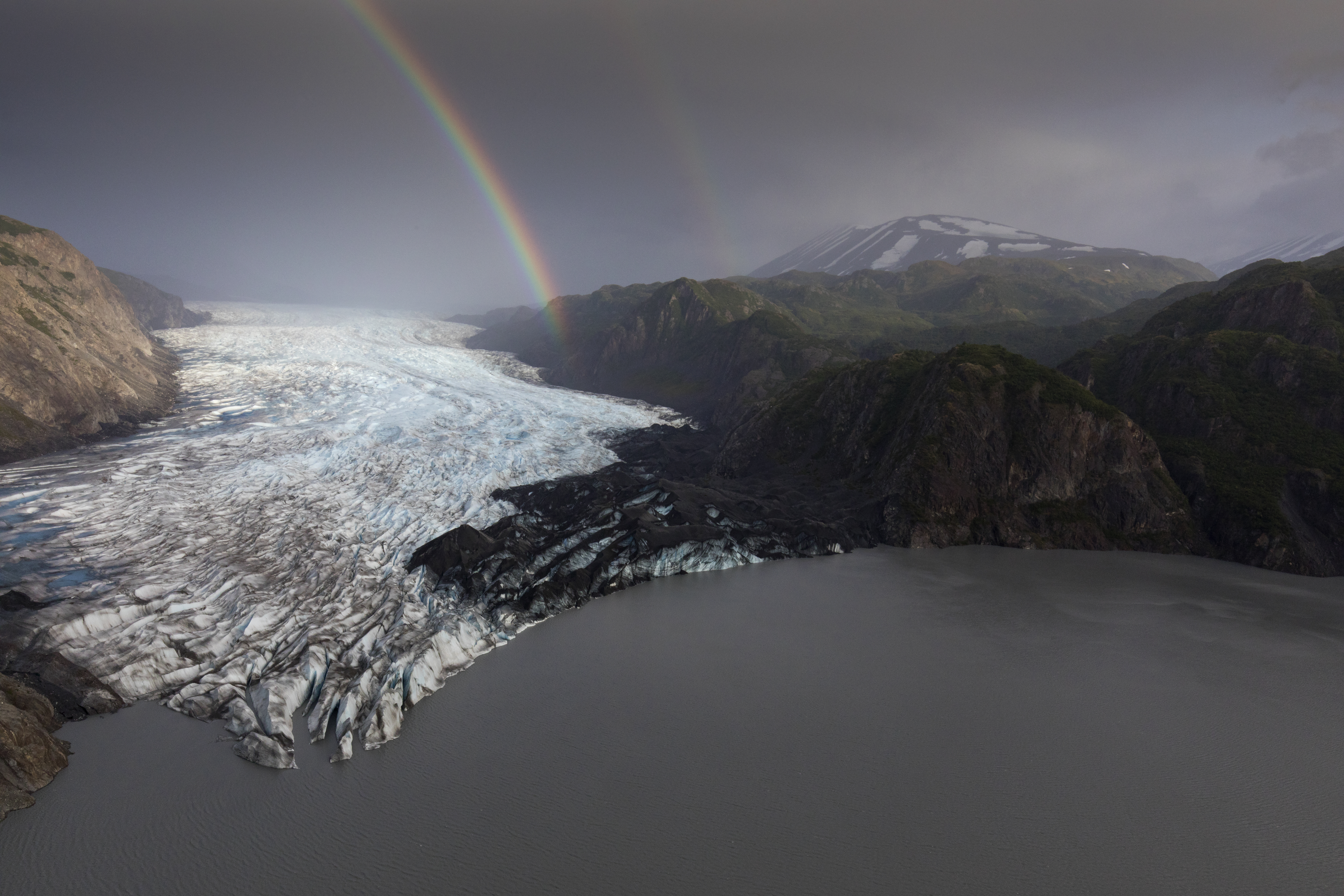 A rainbow arcs over a glacier and lake at Kenai National Wildlife Refuge in Alaska.