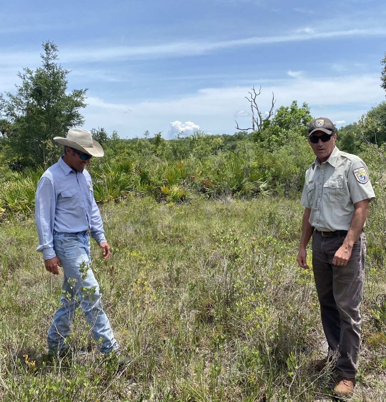 Zach Adams, a rancher, and Bill Miller, the Service’s former project leader for Everglades Headwaters refuge, tour the Adams Ranch in southwest Florida.