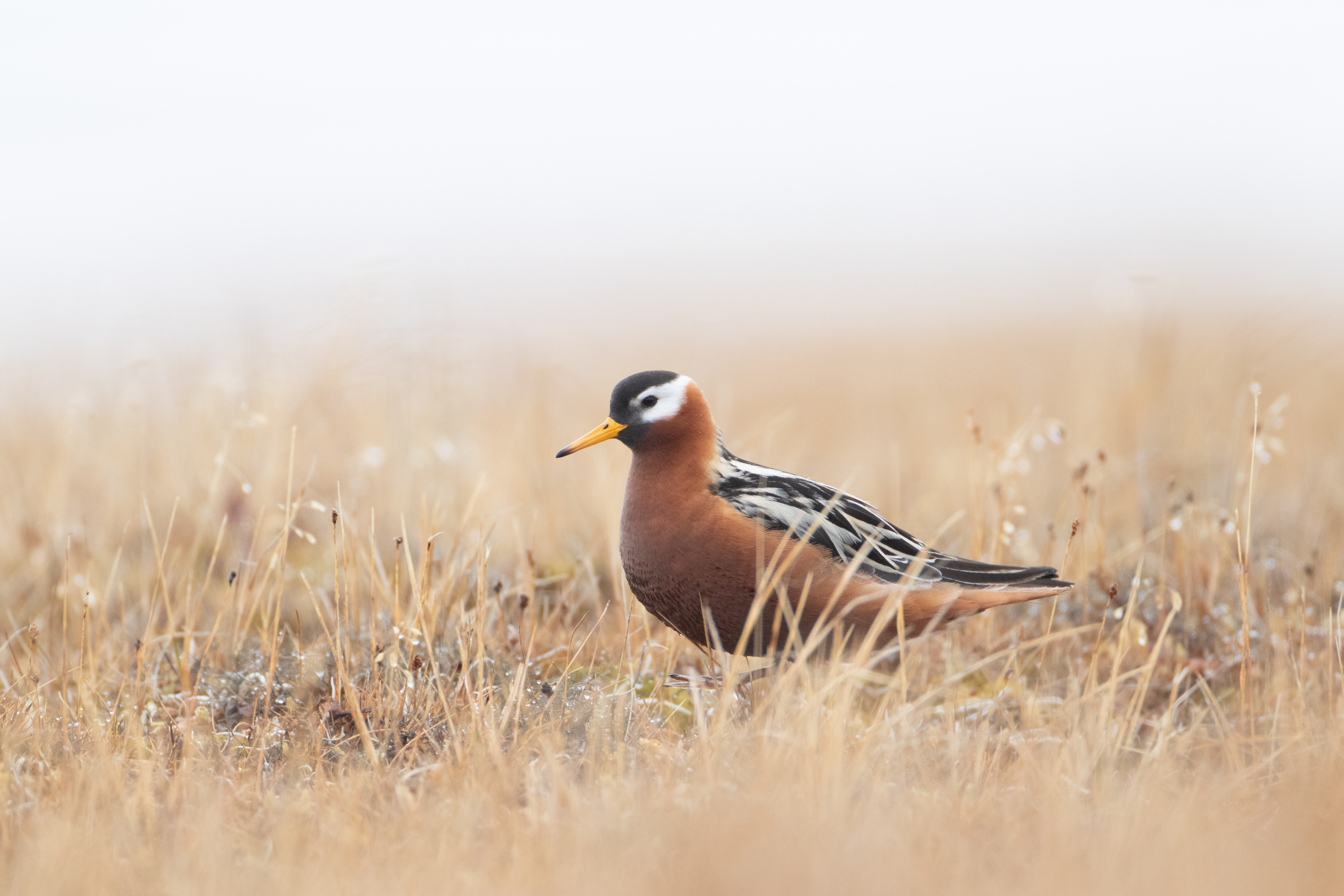 A female red phalarope rests on the tundra in Utqiagvik, Alaska.