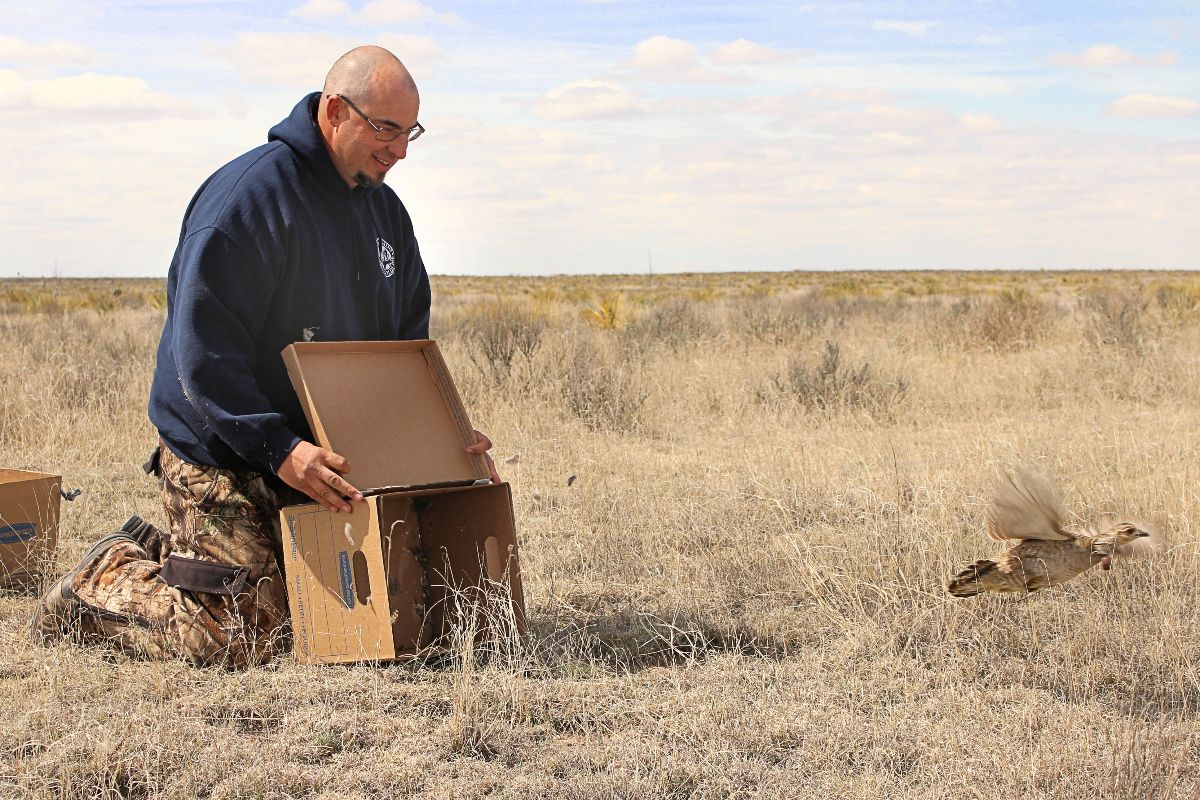 Colorado Parks and Wildlife conservation biologist Jonathan Reitz releases a lesser prairie chicken in the Comanche National Grassland in southeast Colorado as part of a four-year project to restore the birds.