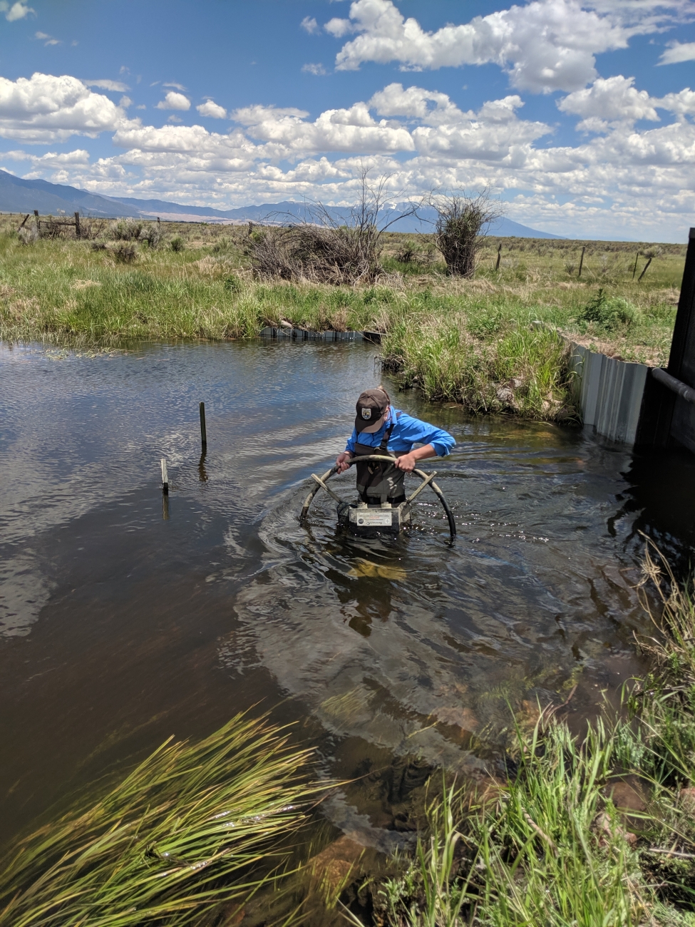 COFWCO staff replace a remote fish detection antenna at the Baca National Wildlife Refuge after replacing the batteries. This antenna detects rare fish species as they move throughout the water system on the refuge.