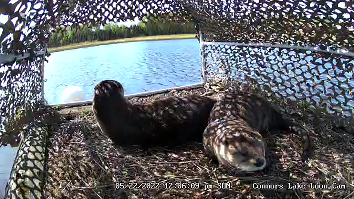 A pair of river otters lounge on the wooden raft, May 22, 2022.