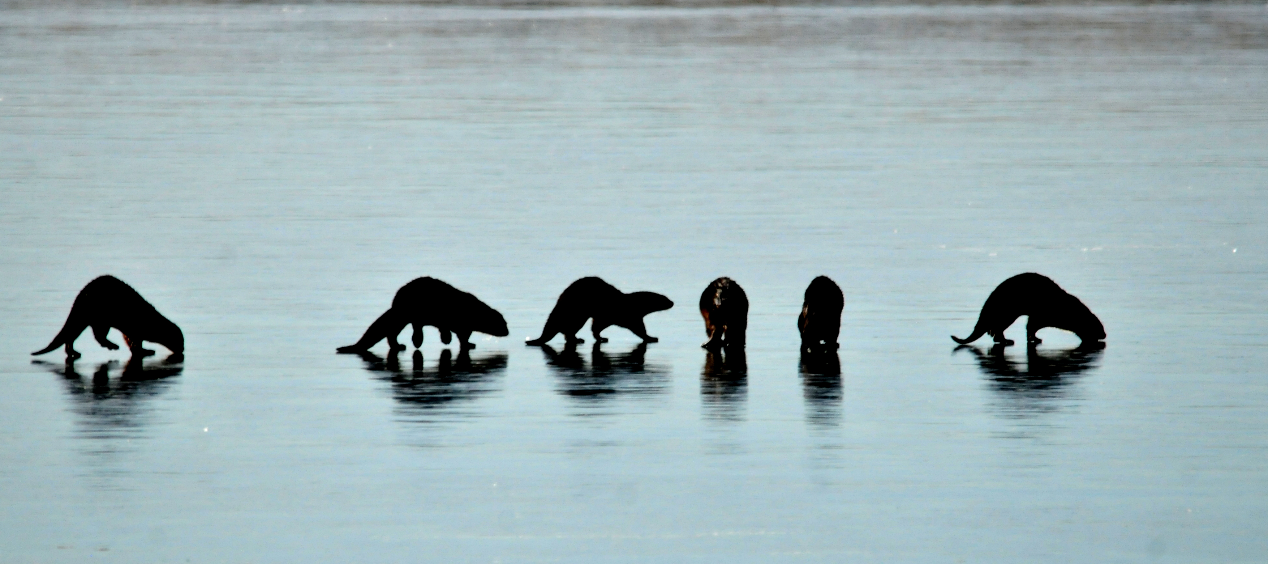 River otters walk out on the frozen surface of a river in winter at Seedskadee National Wildlife Refuge in Wyoming.