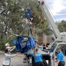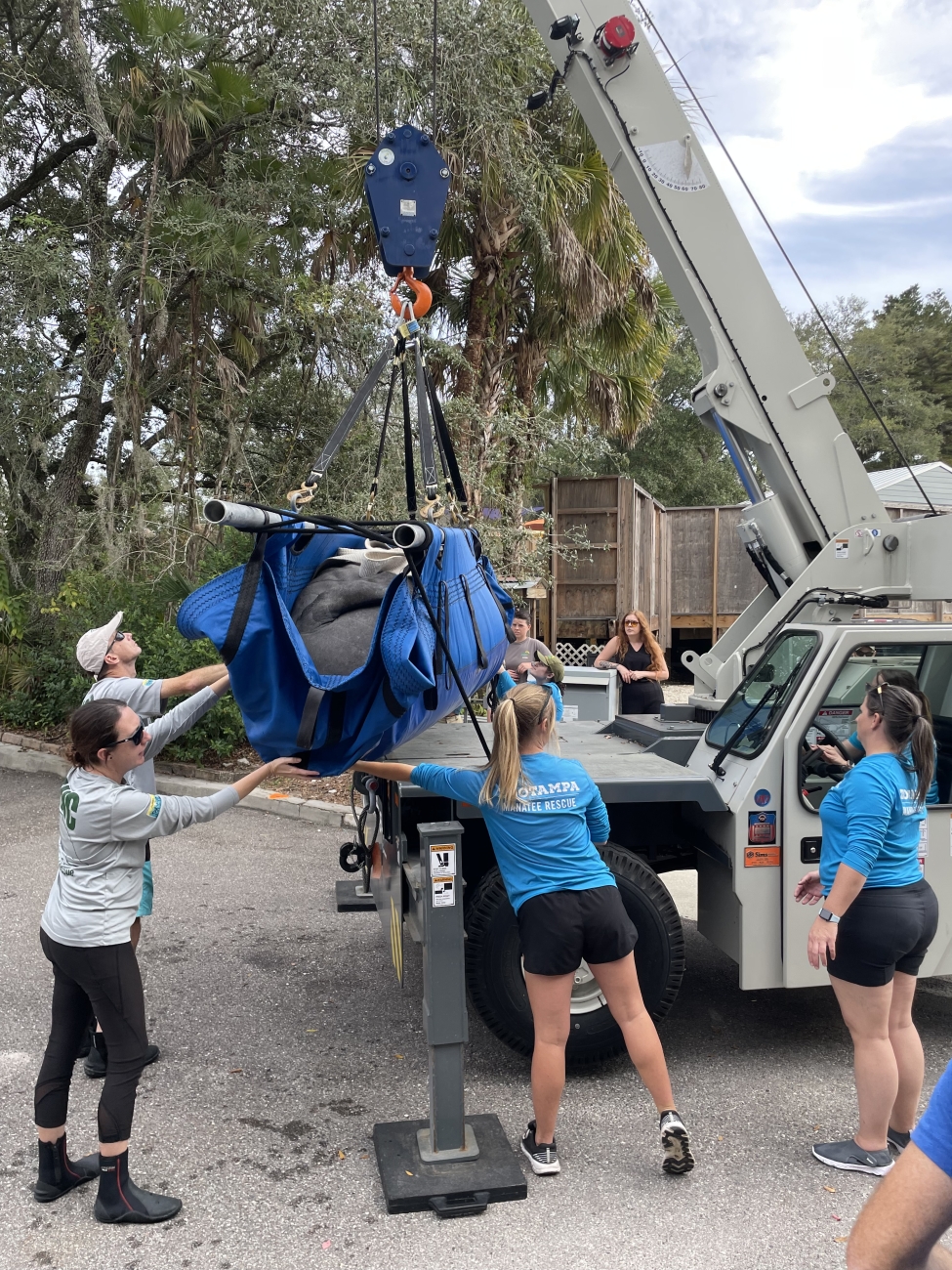 The team uses a crane to hoist the manatee called Romeo from his pool and safely transfer him to the awaiting truck.
