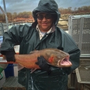 Roy Hicks, of Lahontan National Fish Hatchery, holds a large spawning-age Pilot Peak Lahontan cutthroat trout at the Marble Bluff Fish Passage Facility near Pyramid Lake. Credit: Tim Loux/USFWS