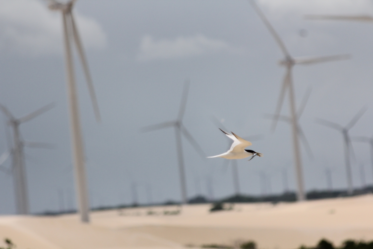 A sandwich tern flies past wind turbines on the coast of Brazil.