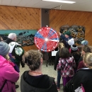 A school-age group of kids are spinning the wheel of migration with a tour provided by a Dworshak volunteer