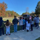 Volunteer Wendy Schultz instructs a school group about fishing techniques at Hatchery Creek during a tour of our facility.