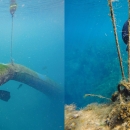 Justin Crow sewing and patching holes in the polypropylene tubing that is part of a large net capture device installed at the bottom of Spring Lake. The net was installed to sample the Texas blind salamander and other aquifer invertebrates.
