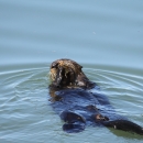 A territorial male sea otter in Moss Landing prepares to eat an invasive exotic green crab.