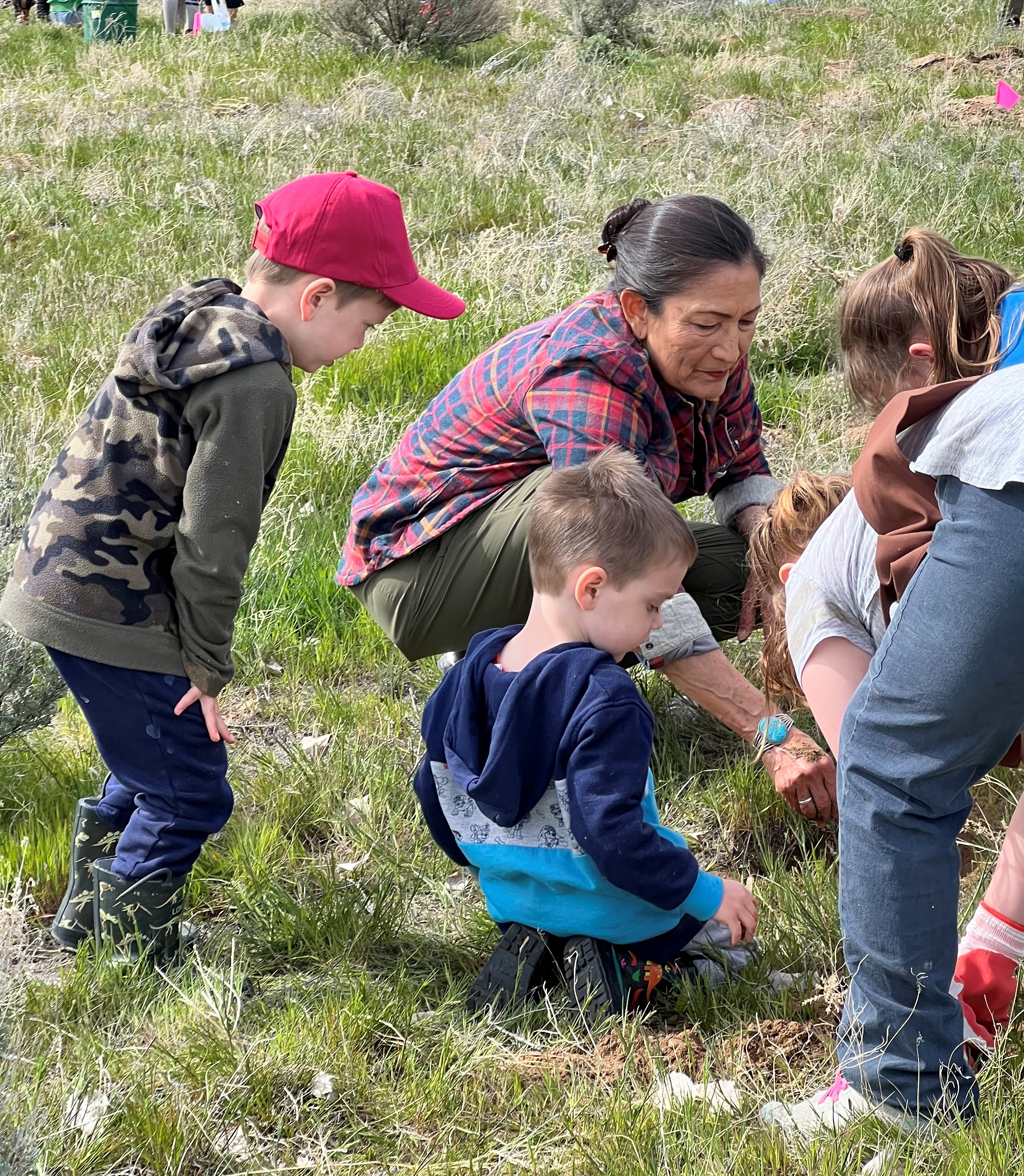 Secretary Haaland plants sagebrush with a group of young visitors at Deer Flat National Wildlife Refuge in Nampa, Idaho during an Urban Wildlife Conservation Program event.