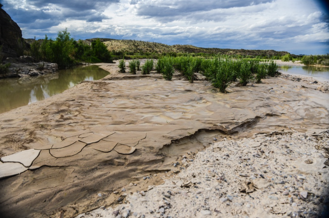 Fine sediment accumulation within and downstream of willow pole plantings at Terlingua Creek.