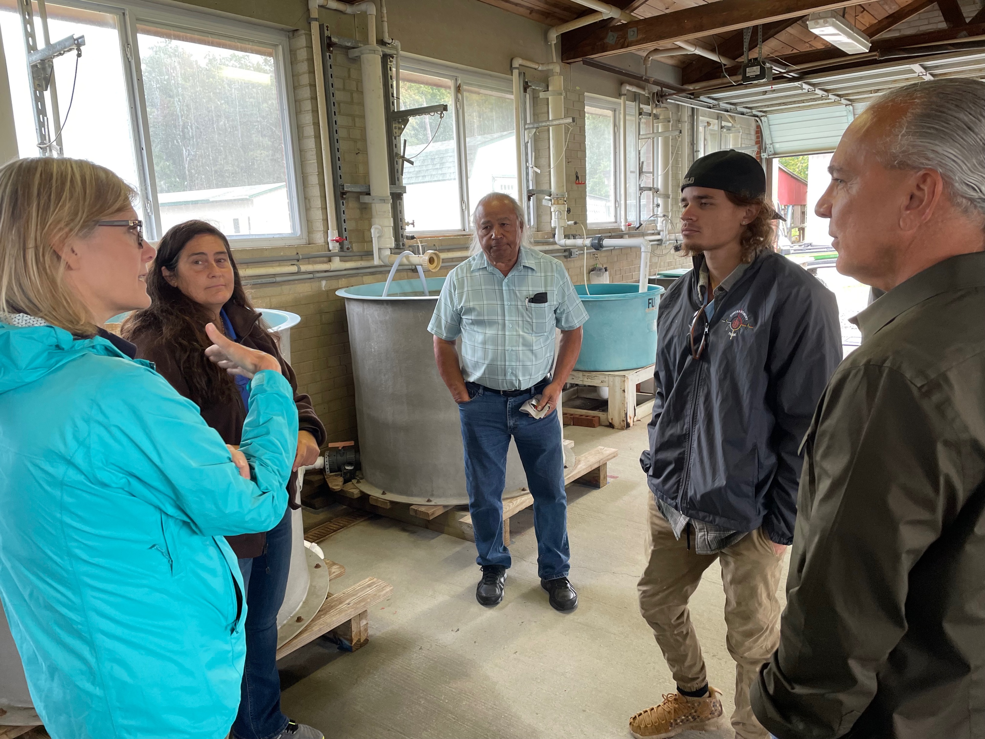 Kyla Hastie, Acting Regional Director, Rachel Mair, Project Leader, Harrison Lake National Fish Hatchery, Chief Stephen R. Adkins, Chickahominy Indian Tribe, Lane Eubank Tribal Hatchery Intern/Employee of the Upper Mattaponi Indian Tribe, and Reggie Tupponce, Tribal Administrator, Upper Mattaponi Indian Tribe meet at Harrison Lake National Fish Hatchery.
