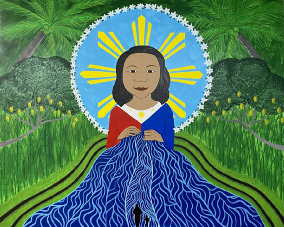 "This mural was inspired by my Filipino heritage and the matriarchs of the Filipino community. It features a variety of plants important in Filipino culture like sampaguita flower, palm, mango, bamboo, and rice. The water below represents the Pacific ocean that was crossed on the journey to the United States. My grandmother is depicted in this mural and holds a needle and sews the path to success for my mother and I." Logan Sauer/USFWS