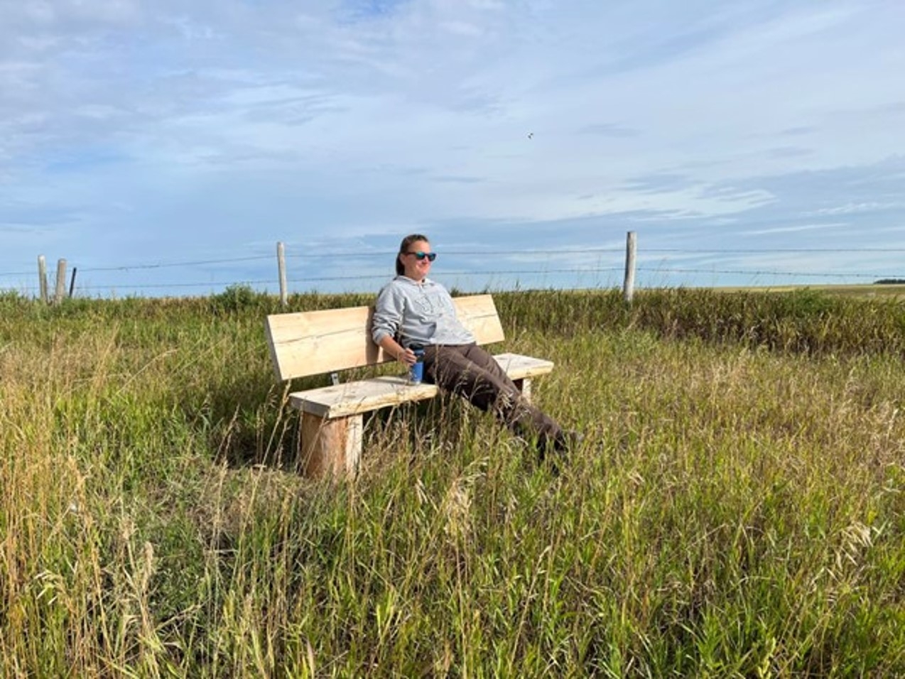 2023 Waterfowl Banding Operations Crew Member Jaime Allen sits on a bench by a lake listening to wildlife.