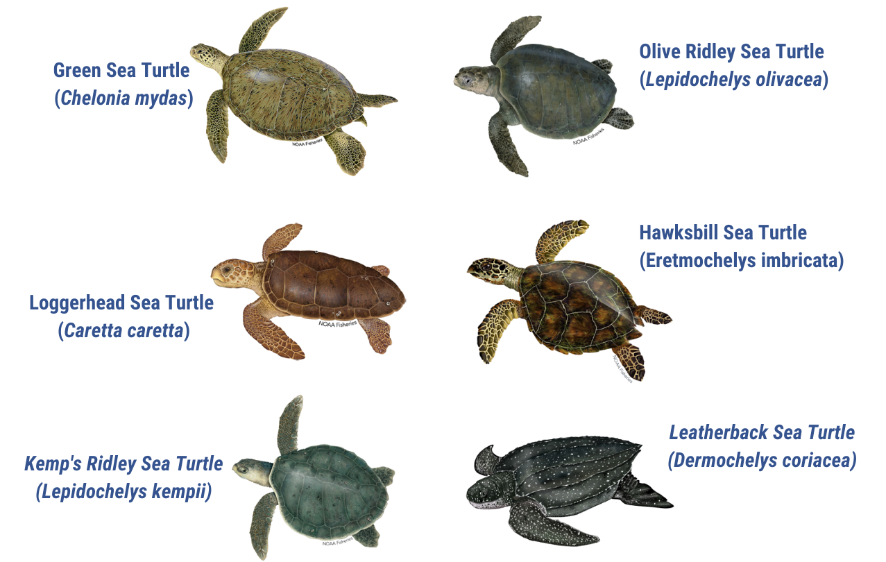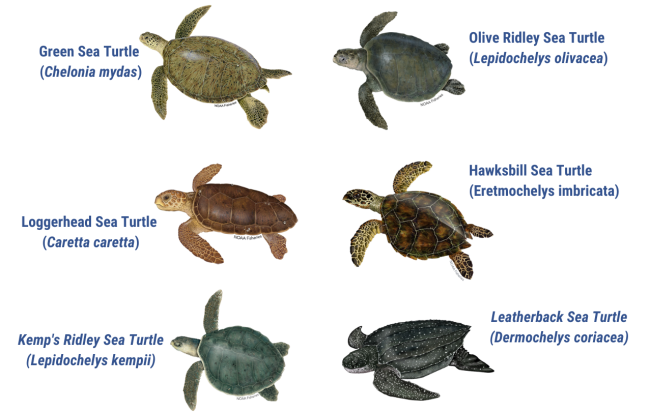 The six sea turtles found in U.S. waters and on U.S. beaches.
