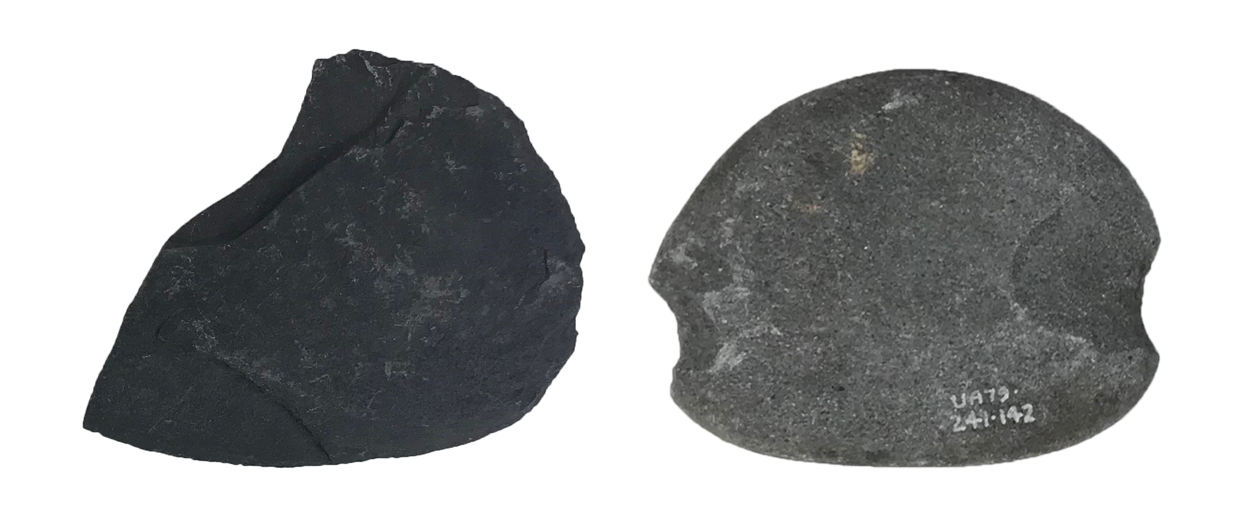 A slate ulu fragment and notched cobble net weight found nearby.
