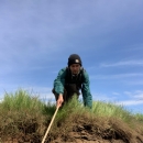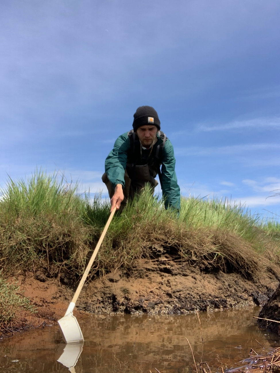 Refuge operations intern dips for mosquitoes at the Ni-les'tun Unit.