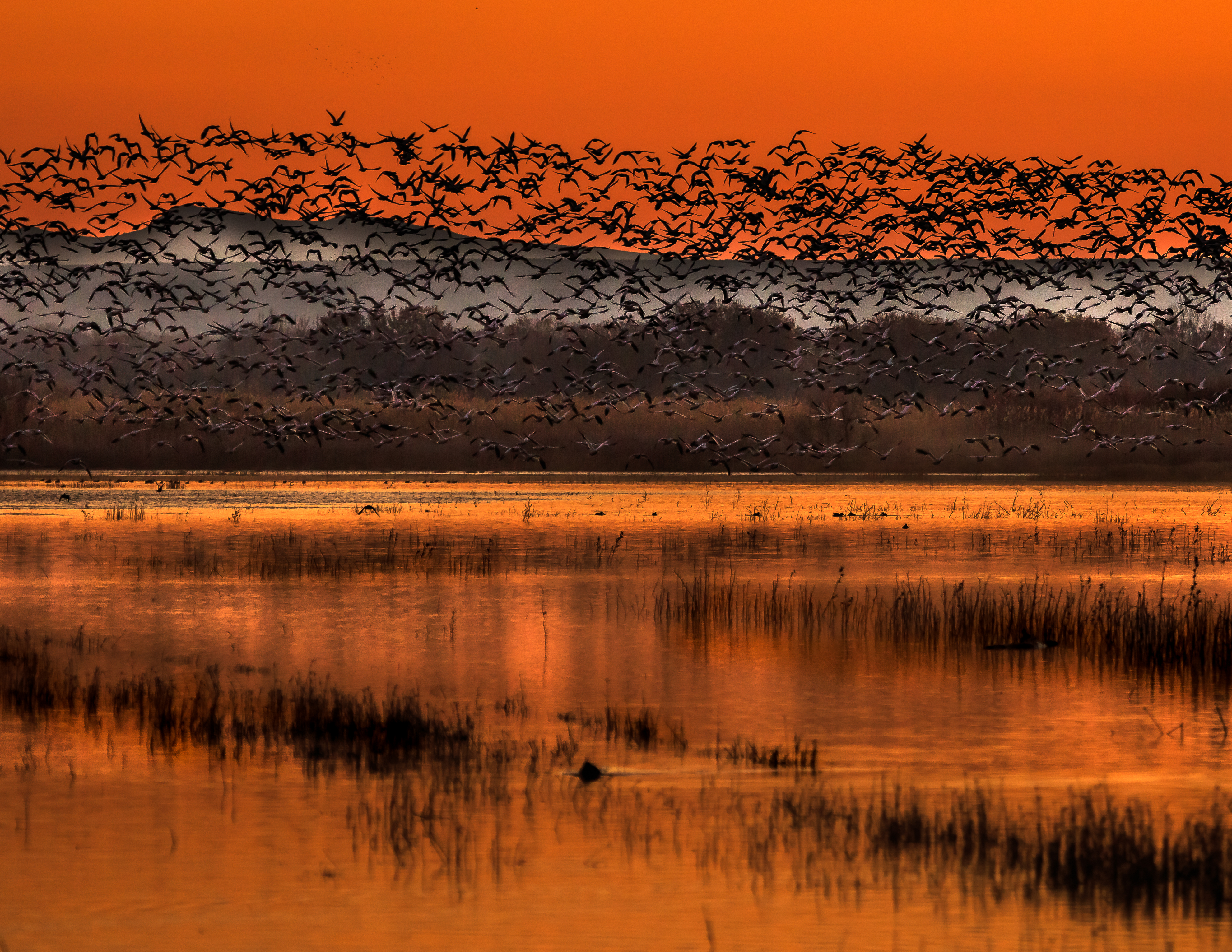 Snow geese fly out at sunrise at Bosque del Apache National Wildlife Refuge in New Mexico.