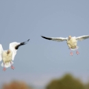 Two snow geese come in for a landing at Sacramento National Wildlife Refuge, about 75 miles north of California’s capital city.
