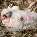 Recently hatched Snowy Owlets snuggle up close in their tundra ground nest