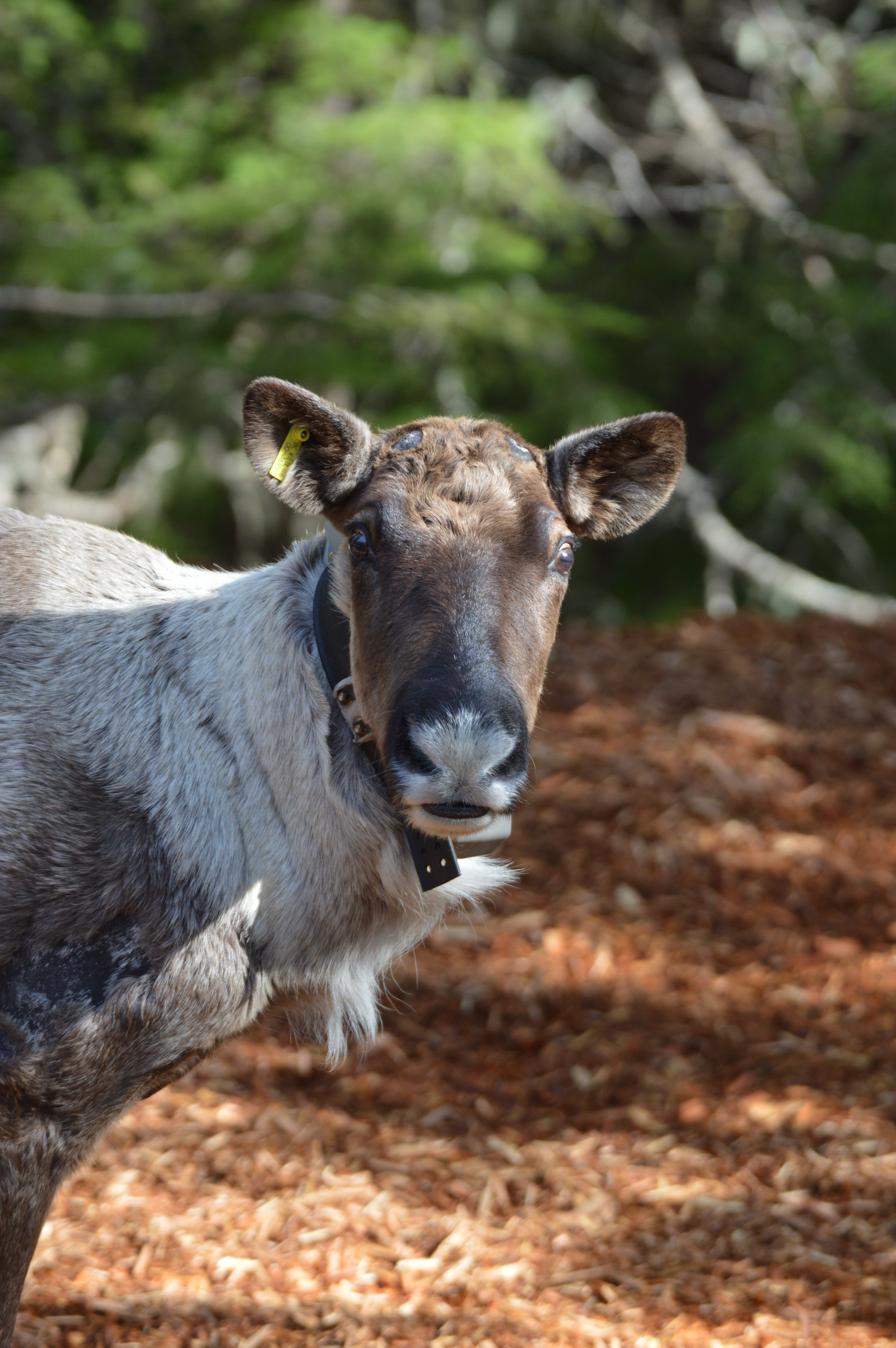 A female southern mountain caribou can be seen with a tracking collar on her neck.