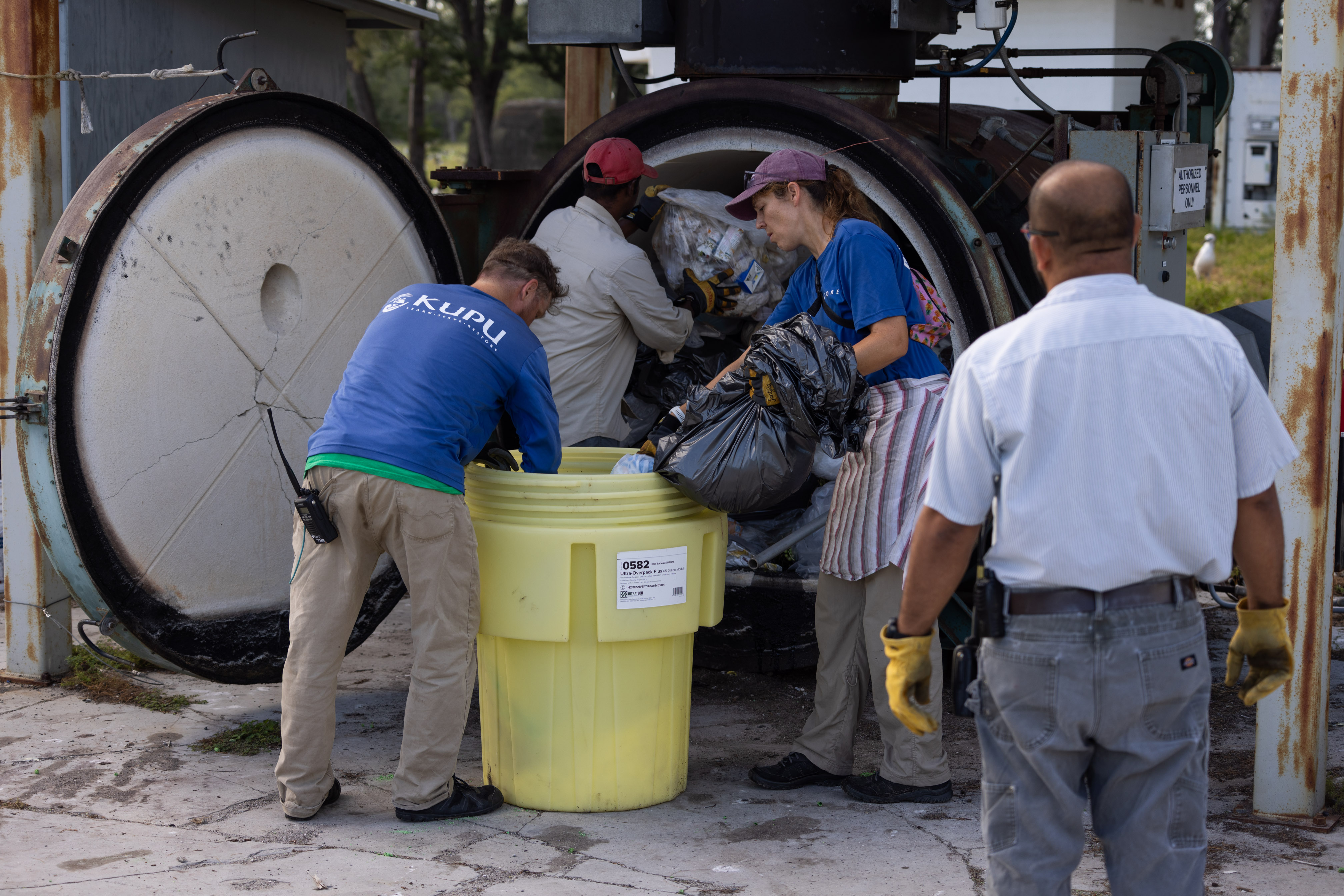 The "PHATT" Team meticulously manages island trash at Midway Atoll National Wildlife Refuge, delivering it to the incinerator, to eliminate alternate sources of food that may distract mice from bait.