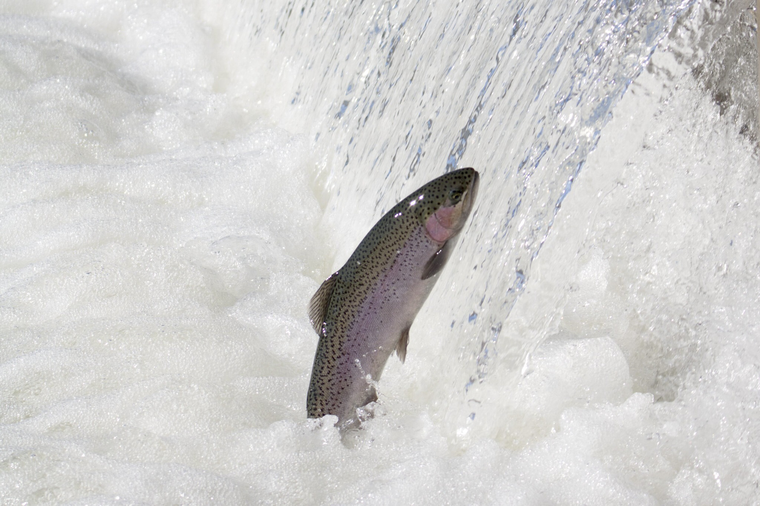 Summer steelhead are the most extreme athletes of the steelhead according to Damon Goodman, a biologist out of the Arcata Fish and Wildlife Office. Here an adult steelhead jumps in a holding pond at the Coleman National Fish Hatchery. Credit: Laura Mahoney/USFWS