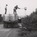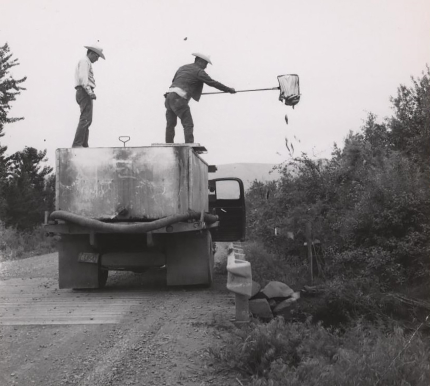 In 1959, fish from Winthrop National Fish Hatchery were taken by tanker truck to streams and lakes in the area for release. In some cases, as seen here, fish were dumped into streams directly from the road, using long-handled nets to pull them out of the tank.