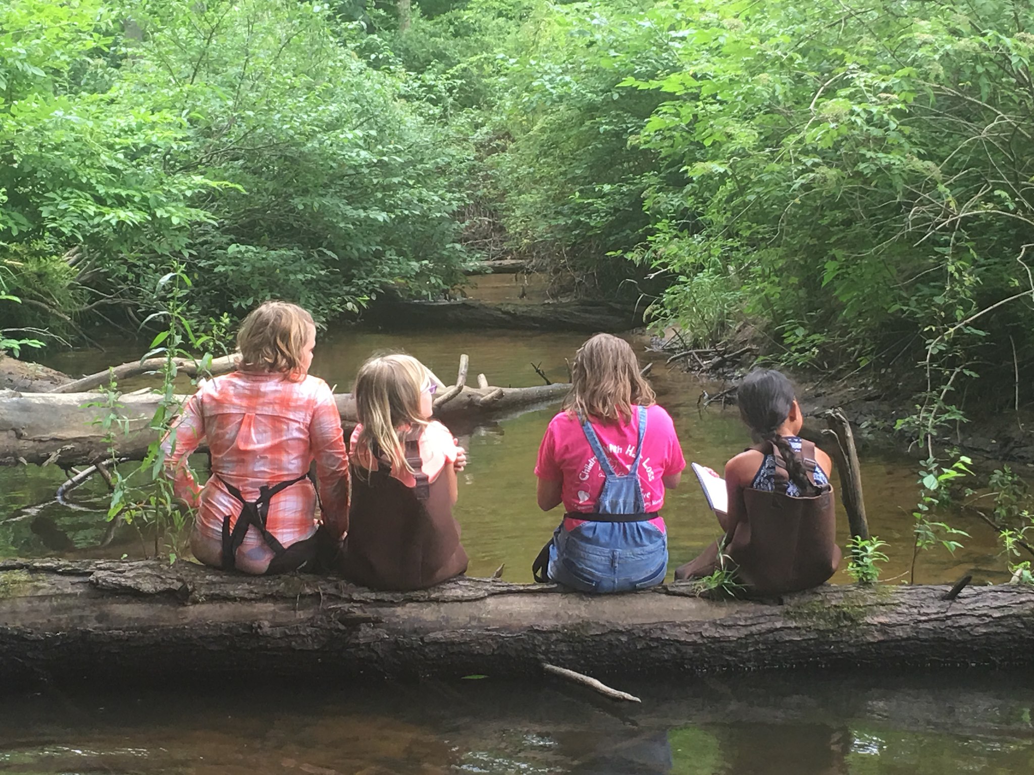 Four girls sitting on a log in waders, making observations about the aquatic vegetation surrounding them.