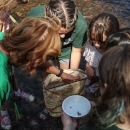 Yancey County students join their teacher around a kick-net to see what aquatic invertebrates they collected.